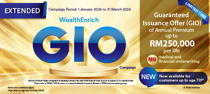 Enjoy a limited time Guaranteed Issuance Offer (GIO) on WealthEnrich; now applicable for customers aged 18 to 70 (next birthday), with a maximum aggregated annual premium of up to RM250,000 per life!