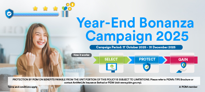 The benefit(s) payable under eligible policy is (are) protected by PIDM up to limits. Please refer to PIDM’s TIPS Brochure or contact AmMetLife Insurance Berhad or PIDM (visit www.pidm.gov.my).